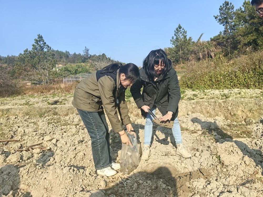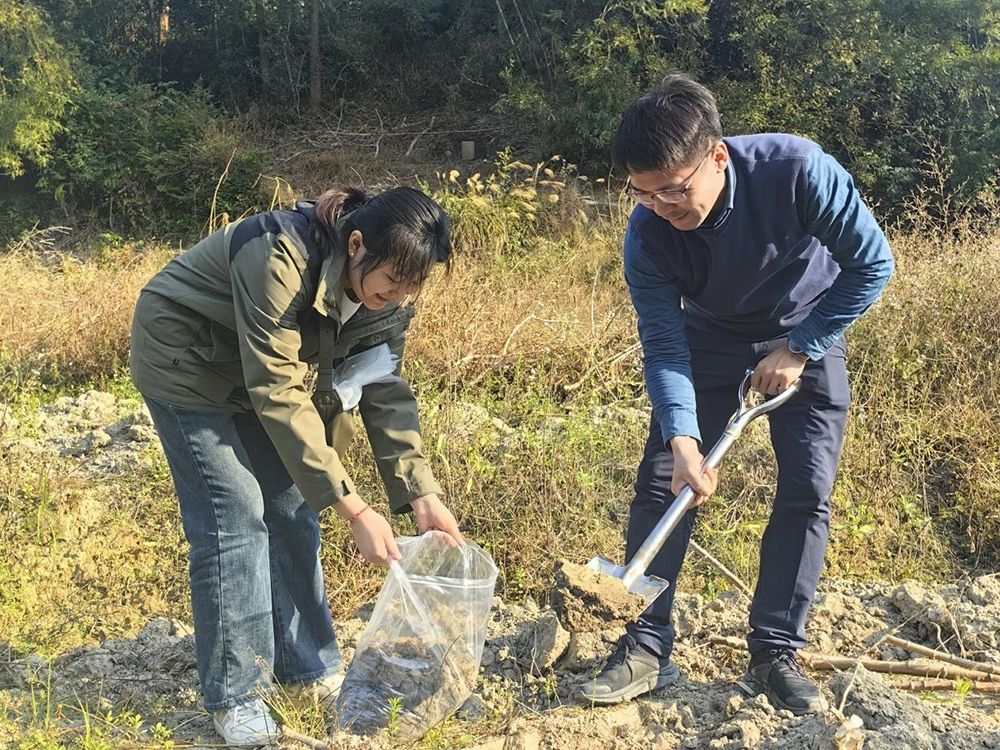学院师生前往茭白种植基地,确定土壤采样点后,现场采样,先将表层土壤去除,以避免杂质的干扰,再采集土壤,装入集样袋中,贴好标签,注明采样点位置、采样时间等信息。