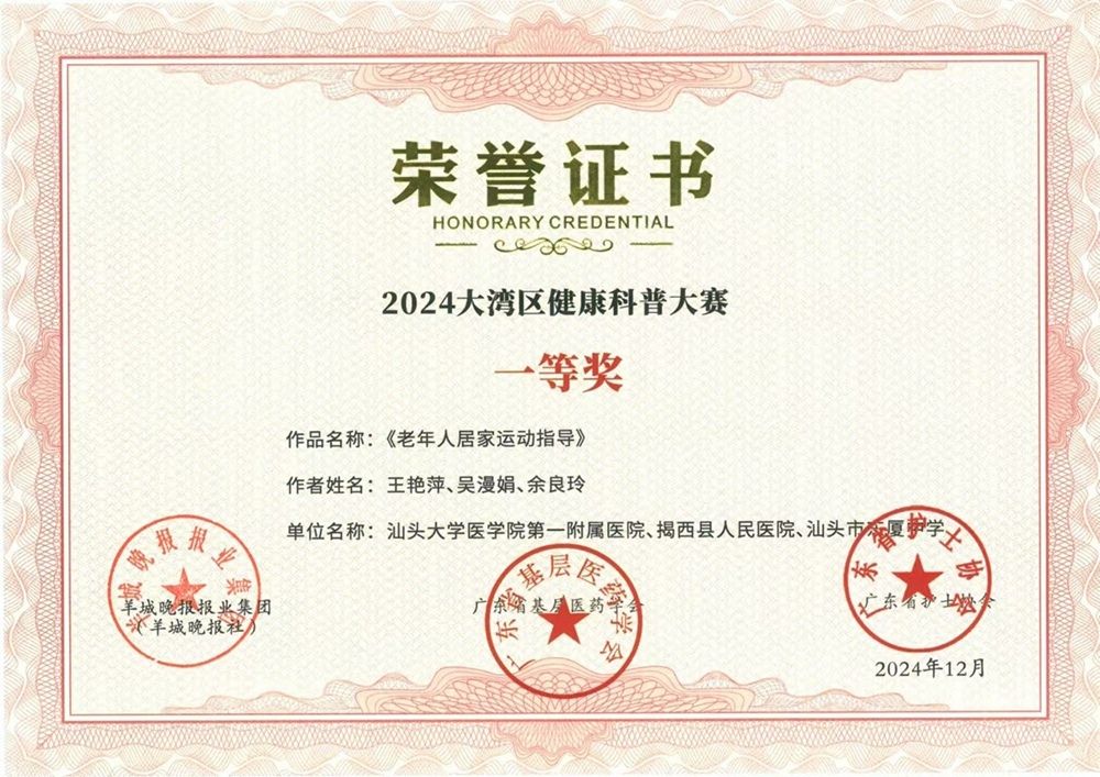 为进一步推动健康知识的普及,弘扬科学精神,以期让健康知识更加贴近民众,服务大众,为健康科普创新赋能,附一院王艳萍医师联合揭西县人民医院治疗师吴漫娟一起制定详细计划,制定一套在床上就可以进行锻炼的一系列方法,可以锻炼核心肌群,特别适合肌骨疼痛、心肺功能差、腰疼的病人的运动方法。该套运动操包含卧位悬空自行车训练、反向自行车训练、直抬腿训练、臀桥训练、强臀桥训练、单脚臀桥训练等。团队还将这些训练方法制作成视频,更好地进行医学知识宣传。同时,团队还报名参加了羊城晚报举办的2024年大湾区健康科普大赛,作品经过初审、网络投票、专家复审、组委终审等层层筛选,最终取得一等奖的成绩。本次科普大赛吸引全国446家医院、机构、组织参赛,共投递视频及图文类健康科普作品1840件。