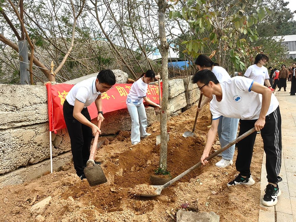 随后,师生团队前往后宅镇永兴村。在植树现场,师生们挥动铁锹、翻垦沃土,时而俯身扶正幼苗,时而合力夯实培土。经过大家的辛勤劳动,一株株绿意浓浓的树苗迎风挺立,为春日乡村增添盎然生机。本次植树活动共种下大叶紫薇、小叶紫薇、花梨木、桂花等120余棵,志愿“红”与初生的嫩绿树苗交相辉映,共绘海岛绿美蓝景。