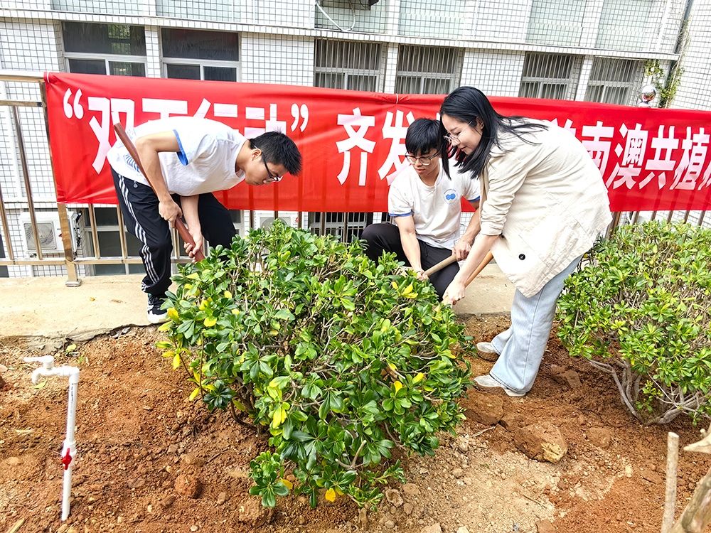 在南澳县教育局的组织下,师生团队首先前往南澳中学劳动教育实践基地,开展“我为南澳种棵树”暨南澳县绿美校园义务植树活动。活动现场,师生分组协作,挥动铁锹培土固根,扶正树苗并浇水养护,陆续种下小叶紫薇、花梨木、桂花等三十余株苗木。