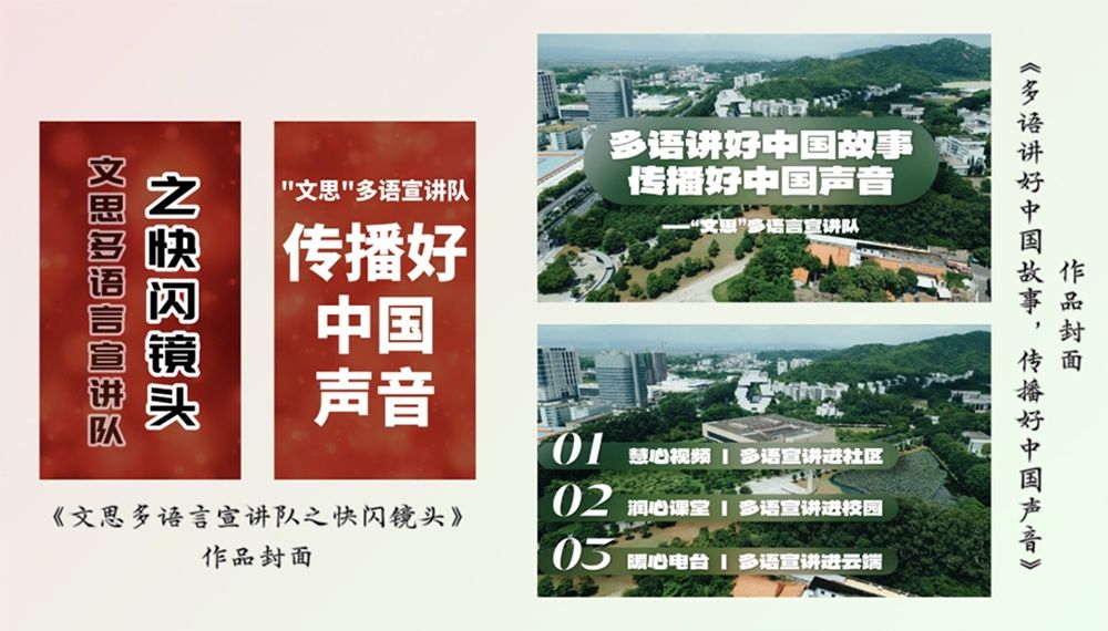 “文思”多语言宣讲队充分发挥语言学科优势,创新打造“线上云宣讲+线下微宣讲”模式,通过“文宣行动”“三下乡”等实践活动深入校园、社区和乡村开展多语言宣讲。队伍成功构建包括广播电台、短视频、实践课堂等在内的立体化传播矩阵,推出“多语讲好中国故事”系列视频、“多语传声”系列网文等特色项目,以中、英、西、泰等多语言生动讲述中华优秀传统文化、革命文化和社会主义先进文化。目前宣讲队已累计开展宣讲活动近20场,制作多语视频10余个,开展“文思”广播电台多语栏目5期,覆盖受众超万人次,既有效提升了队员的专业实践能力,又创新了文化传播方式,为构建中国话语体系、增强国际传播能力贡献青春力量。