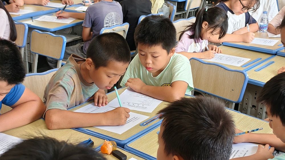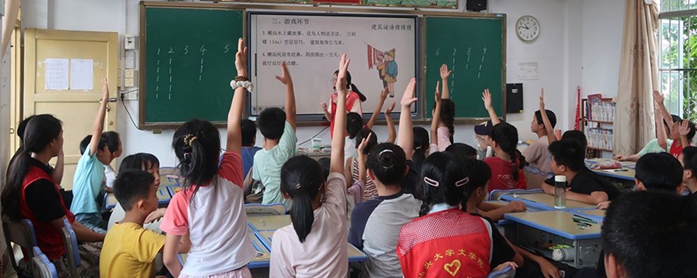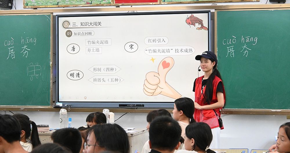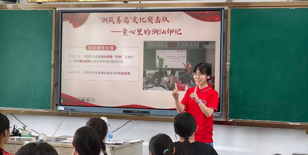 本次活动中,“潮筑善启”文化突击队还特别设置了潮汕建筑文化与普通话的课堂。课堂以“语传古建魅力”为主题,通过潮汕传统建筑图片展示、方言互动对比等形式讲解了普通话的重要性。在课堂上,队员首先讲解了普通话定义及发音技巧,随后带领学生开展“绕口令大挑战”“谜语猜猜猜”等分组积分活动,最后以知识树回顾课堂内容,并且集体宣誓“说好普通话,传承潮汕美”。通过这种形式,既提升了学生的普通话表达能力,又加深了学生对潮汕建筑文化的认知。