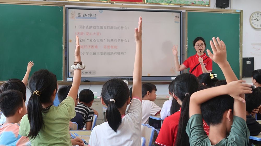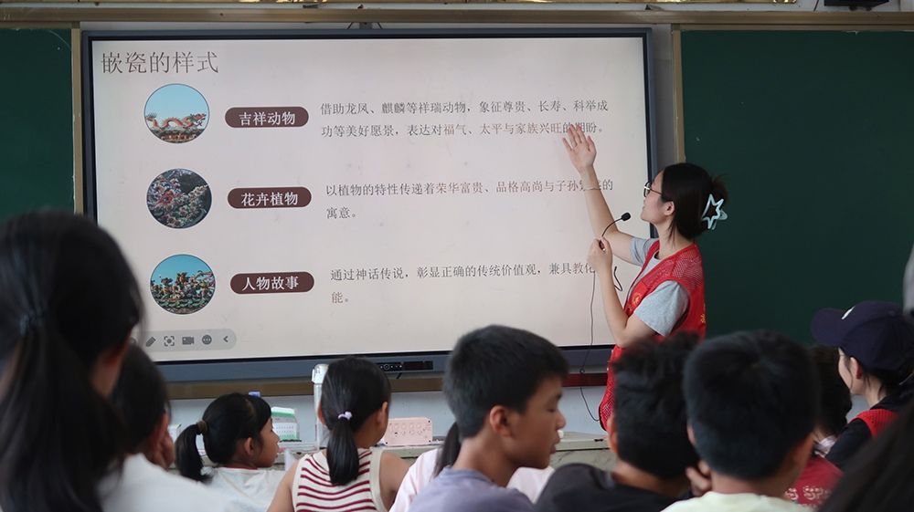 课堂融合了故事讲述、角色扮演、互动讨论等多种方式进行授课,学生们积极参与,课堂气氛活跃。队员们以潮汕建筑屋脊上的“厝角兽”为主角,通过拟人化的方式,生动讲述了潮汕建筑从唐宋到明清时期的演变过程,让学生了解潮汕建筑在不同历史时期的特点。同时,还引导学生变身“潮汕古建小侦探”,通过“民俗故事盲盒”游戏,抽取并分享民俗故事卡,深入探讨潮汕建筑与民俗活动之间的关联。学生们通过趣味问答,进一步体会到潮汕建筑在满足民俗需求、体现风水寓意等方面的魅力。