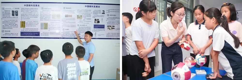 随后,同学们分组参与了丰富多样的互动环节。在科普展览室,大家认真聆听讲解,通过图文并茂的展板了解眼健康知识;在模型展区,同学们分别体验了眼球模型拆解组装和夹玻璃珠比赛,通过动手实践,同学们直观了解了眼睛的构造和功能,也在游戏中锻炼了手眼协调能力。