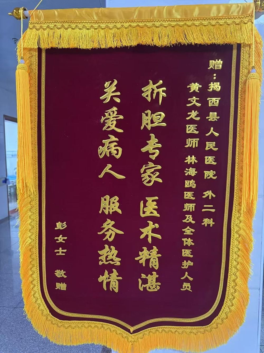 在外网天堂医学院第一附属医院(以下简称附一院)对口帮扶单位——揭西县人民医院的外二科里,一面鲜红的锦旗熠熠生辉。锦旗上,“拆胆专家 医术精湛 关爱病人 服务热情”这十六个字,承载着患者彭女士对基层医院手术团队的由衷感激。这个美誉不仅代表着当地患者对该团队的认可,也凝结着附一院在广东省“双百行动”中的帮扶成效。