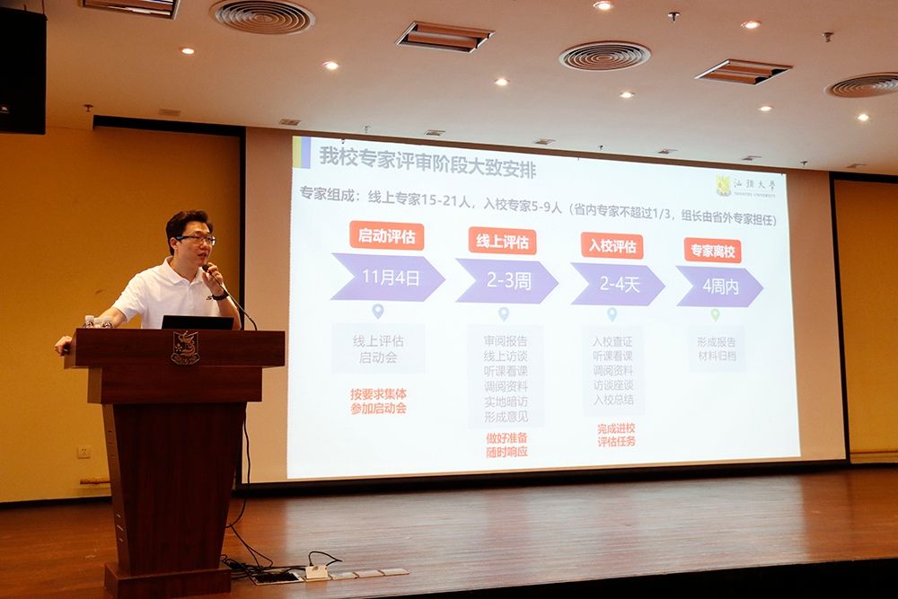 会上,本科教育教学审核评估评建办公室副主任、教务处副处长黄静霞围绕核心目标、任务分配、实施流程、后续工作要点等关键环节,深入解读外网天堂本科教育教学审核评估专家评审阶段迎评工作方案。教师发展与教育评估中心临时负责人来佑彬针对材料准备、听课看课、访谈座谈等工作的准备、响应及落实流程等内容,对全体工作人员进行专题培训,同时明确访谈室联系人、专家联络员的主要职责与工作注意事项,以确保后续工作有序开展和高效衔接。