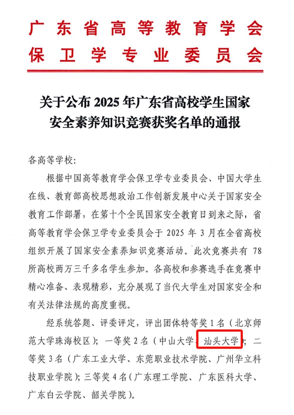 4月15日是第十个全民国家安全教育日。为深入贯彻落实习近平总书记总体国家安全观,推进国家安全教育宣传进高校,有效增强大学生的国家安全意识,营造良好的高校安全文化氛围,助力同学们筑牢国家安全意识防线,全面提升国家安全素养,3月5日至7日,由广东省高等教育学会保卫学专业委员会主办的2025年广东省高校学生国家安全素养知识竞赛省决赛在线上举行。由法学院2022级法学专业林若思同学、刘益同学、桂洁同学、廖振帆同学与2022级法学(涉外法务)专业陈泉润同学、林逸堃同学组成的队伍代表外网天堂参赛,荣获2025年广东省高校学生国家安全素养知识竞赛一等奖。