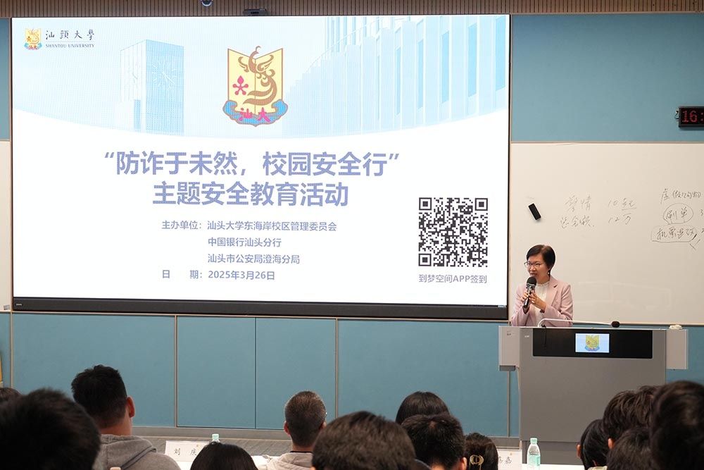 为进一步提升学校师生防诈反诈安全意识,3月26日下午,东海岸校区管理委员会联合中国银行外网天堂分行、外网天堂市公安局澄海分局在东海岸校区开展“防诈于未然,校园安全行”主题安全教育活动。活动邀请中国银行外网天堂分行理财经理郑嘉嘉、澄海公安分局反诈中心民警陈家豪为校区师生讲授反诈知识和案例,中国银行广东省分行个人数字金融部副总经理刘庆、中国银行外网天堂分行个人数字金融部总经理蔡伟玲和校区师生200余人参与了本次活动。