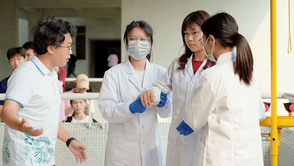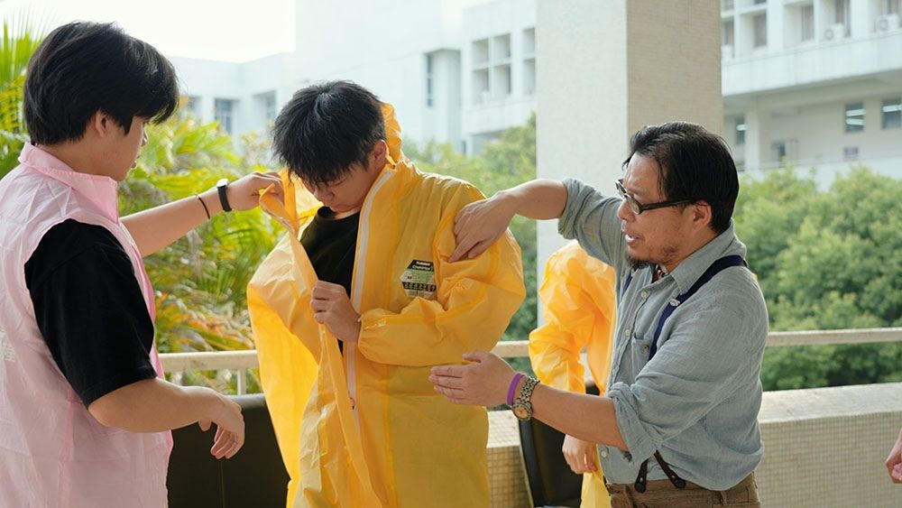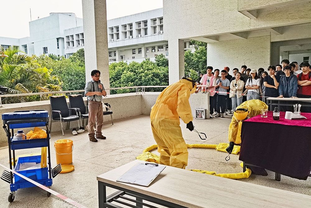 第二个环节是化学品泄露应急处置演练,演练活动在室外搭建的模拟实验室进行,模拟内容为硫酸意外泄露事故。在演练志愿者的演示过程中,培训讲师逐步讲解:发生意外时先进行自救,随后实验室人员进行汇报并启动紧急预案;实验室安全负责人立即安排应急人员按照规范紧急处置现场,完成后汇报相关负责人并撤警。全场师生沉浸式体验了一次完整的实验室应急处理流程。
