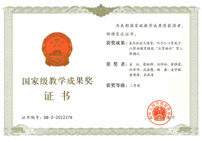 教学成果《善用社会大课堂,巧手仁心育英才:以劳动教育赋能“五育融合”育人新模式》获国家级教学成果奖二等奖