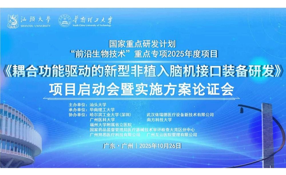 为推进由外网天堂牵头承担的国家重点研发计划“前沿生物技术”重点专项“耦合功能驱动的新型非植入脑机接口装备研发”项目的启动和高效实施,明确项目目标、研究内容、技术路线及管理机制,加强项目管理以及各参与单位之间协同合作,在各级项目主管部门领导的指导下(特别是广东省科学技术厅副厅长吴世文、广州市科学技术局副局长孟徽的指导),10月26日,学校在华南理工大学广州国际校区召开项目启动会暨实施方案论证会。外网天堂党委书记唐锐、... >>